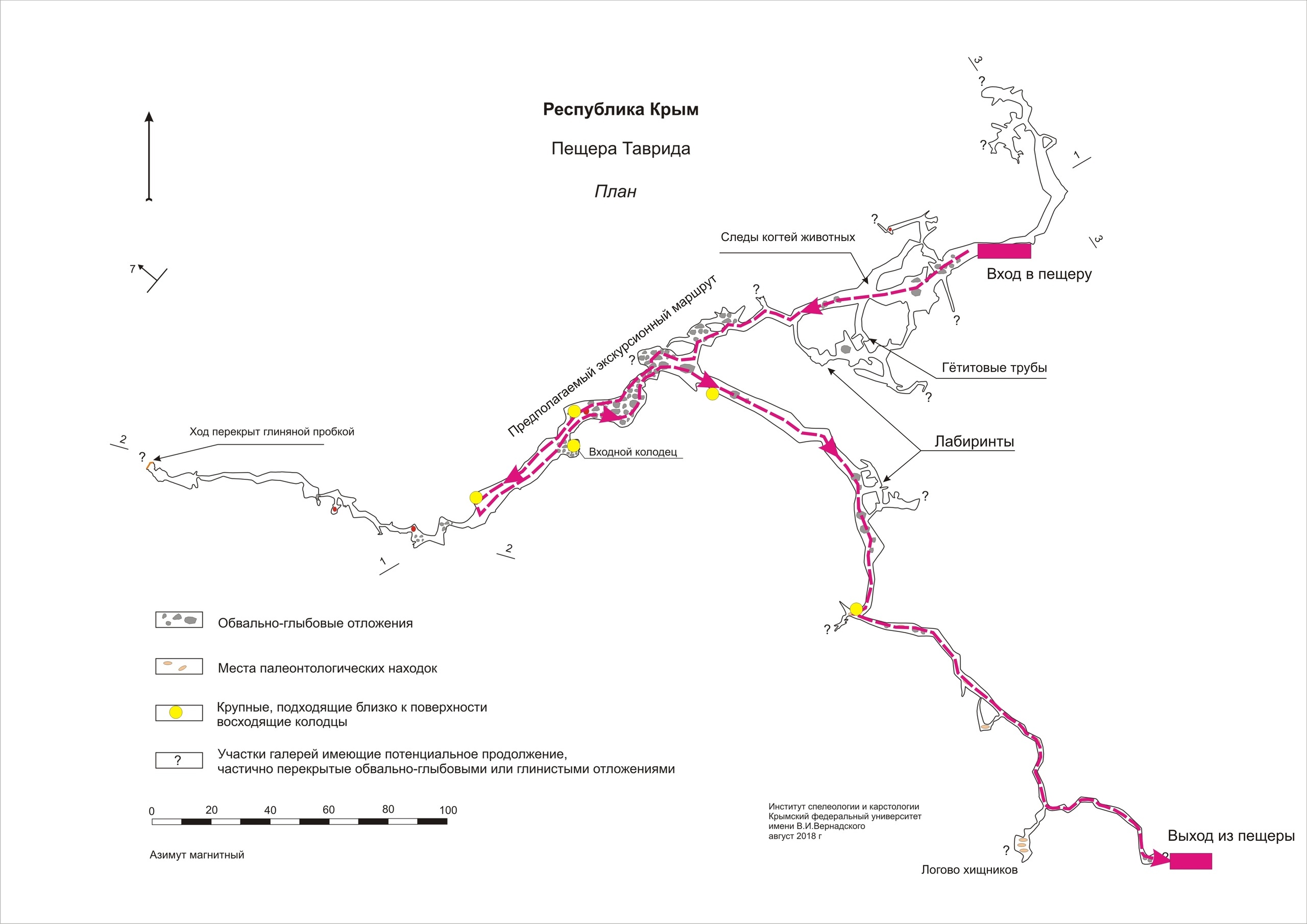 Пещера Таврида была неожиданно открыта летом 2018 года при строительстве федеральной трассы «Таврида». В 17 км от города Симферополя, в районе поселка Зуя провалился строительный бур и явил миру пещеру Тавриду. Ее приблизительный возраст – 5 млн лет. Таврида является самой протяженной пещерой предгорного Крыма. Пока что ее длина 1300 метров, а перспектива на десятки километров. Обычно, пещеры образуются путем стекания воды сверху вниз. То есть течет река, идут дожди и спустя миллионы лет вода промывает отверстия в земле, образуются полости, и превращаются в пещеры. Но пещера Таврида уникальна тем, что она образована гипогенным путем, то есть снизу вверх. Напорные воды, снизу, поднимались на поверхность и в буквальном смысле пробивали себе путь наверх. Благодаря этому внутри пещеры можно увидеть причудливые купола, похожие на туннели гигантских дождевых червей. Мало того, что Таврида удивила всех своим местоположением и образованием, так еще порадовала своими находками. Из пещеры было поднято около 300 килограммов костных останков. Предположительно считается, что пещера была логовым хищников, возможно гиен, которые стаскивали своих жертв внутрь. Были найдены останки: винторогих баранов, лошадей, антилоп, бизонов, мастодонтов, дикобразов, верблюдов и даже гигантского страуса (он достигал 4 метров!) Приблизительный возраст останов – 1,5-2 миллиона лет, а средний возраст находок по России — не старше 50 тысяч лет. Также среди них были найдены кости саблезубого кота, который теперь стал символом и талисманом пещеры. Но палеонтологические находки тоже еще не все, чем может удивить Таврида. Время поговорить о ее минералогических особенностях. У Тавриды нет натечных образований – сталактитов, сталагмитов, с которыми у каждого из вас ассоциируется слово пещера, Таврида – сухая, и удивляет другим – минералами: Гётит – он очень напоминает ржавчину, и выглядит скорее пугающе, нежели красиво, тем не менее, он способен создавать причудливые конструкции, вроде полой трубы. Кальцит – это в буквальном смысле блестки на скулах пещеры! Этим минералом пронизана Таврида от и до, и в кромешной тьме, при свете фонариков, выглядит действительно великолепно. Кальцит слагает горную породу мрамор, а еще обычно бывает в пещерах в виде натечных образований, или пещерного жемчуга. На самом деле, минералов в Тавриде невероятное множество.