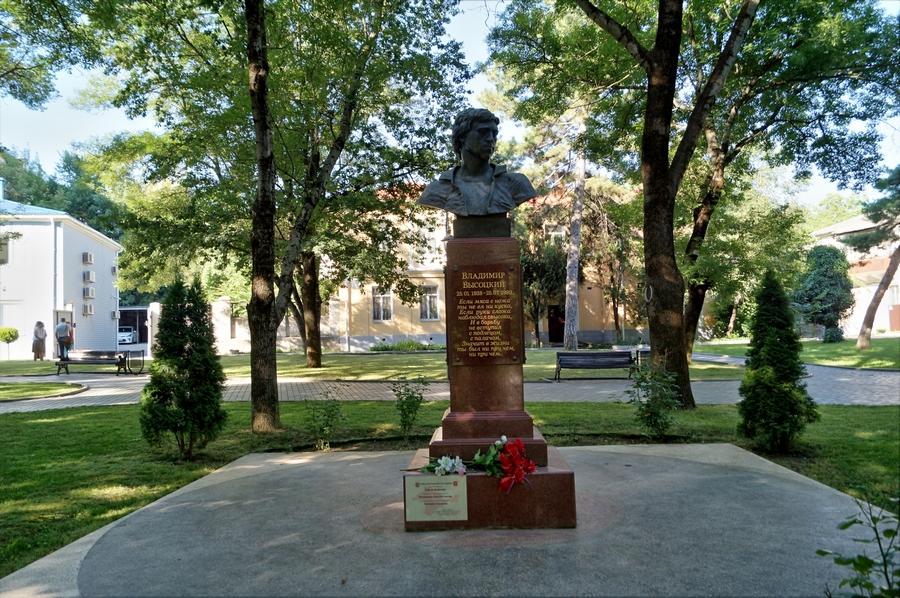 25 июля 2014 года в Симферополе на ул. Набережная, рядом с Суворовским спуском прошла церемония открытия памятника известному поэту, барду Владимиру Высоцкому. Памятник установлен в сквере названном в честь актёра и исполнителя, любимца миллионов Высоцкого В.С. Бронзовый бюст Высоцкого, установленный на мраморном постаменте, был передан городу в дар от в рамках проекта «Аллея российской славы». Памятник привезли из Краснодара. Руководитель проекта "Аллея русской славы" Михаил Сердюков. Торжественная закладка камня на месте будущего памятника на набережной Салгира состоялась еще в мае 2009 года, с тех пор собирались средства на его установку. Полностью собрать всю сумму не удалось. Проект был реализован организацией «Аллея российской славы». Памятник Высоцкому появился в Симферополе не случайно – артист снимался в фильмах на территории Ялты, Евпатории и Алушты. Так, в Крыму с его участием был снят знаменитый фильм «Служили два товарища», где он с блеском сыграл яркий образ белого офицера – Брусенцова. Другой известный фильм, снятый в Крыму с участием Высоцкого, – трагическая мелодрама «Плохой хороший человек» по повести Чехова «Дуэль».