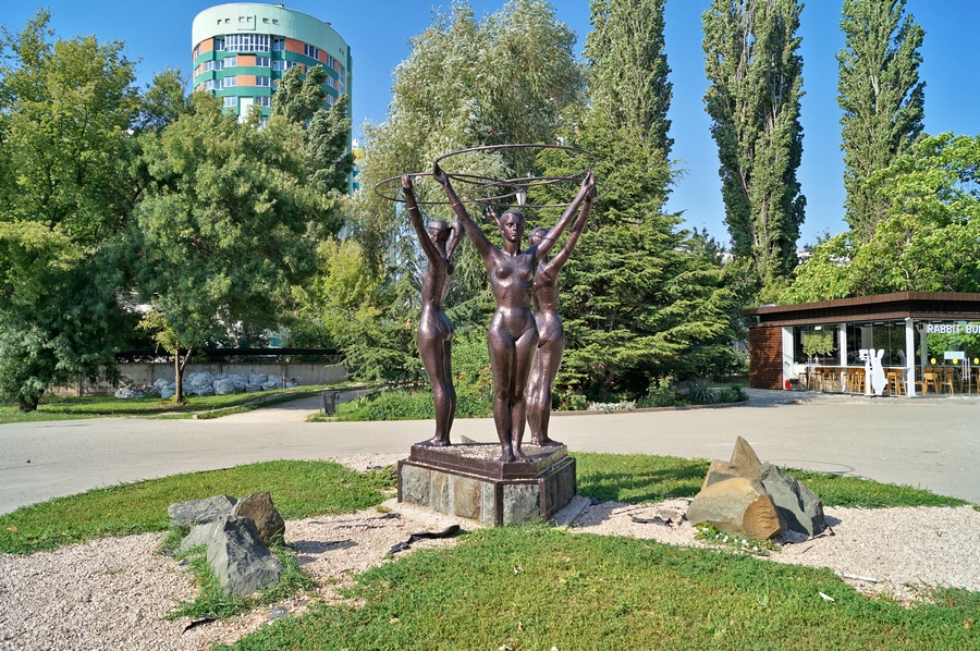 Памятник был установлен в симферопольском парке Гагарина в 1967 году. Он подчеркнул значение парка, как спортивно-досугового центра. Изначально, скульптура изображала трёх девушек, поднимающих высоко над головами обруч. Но позже была проведена реставрация, в ходе которой обруч был снят. Прототипами «Трёх граций» являются танцовщицы одного из коллективов города, до сих пор проживающие в Симферополе.