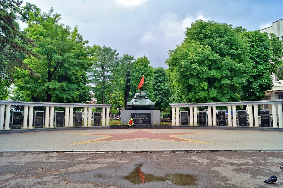 В апреле 1944 года Симферополь был освобождён от немецко-румынской оккупации, в ходе наступления советских войск. В честь этого события, практически сразу после освобождения города, была выдвинута идея об установке памятника. Для возведения мемориала был выбран танк ОТ-34, являющийся огнемётной модификацией Т-34. Он установлен на высоком каменном постаменте, в нижней части которого выбита памятная надпись. Памятник-танк, установленный в сквере Победы 3 июня 1944 года в память об освобождении Симферополя 13 апреля 1944 года частями 19-го танкового Краснознамённого Перекопского корпуса. В 2000-х годах из-за реконструкции сквера постамент с танком был демонтирован и перенесён на небольшое расстояние, ближе к зданию Госсовета РК. Является объектом культурного наследия Республики Крым регионального значения.