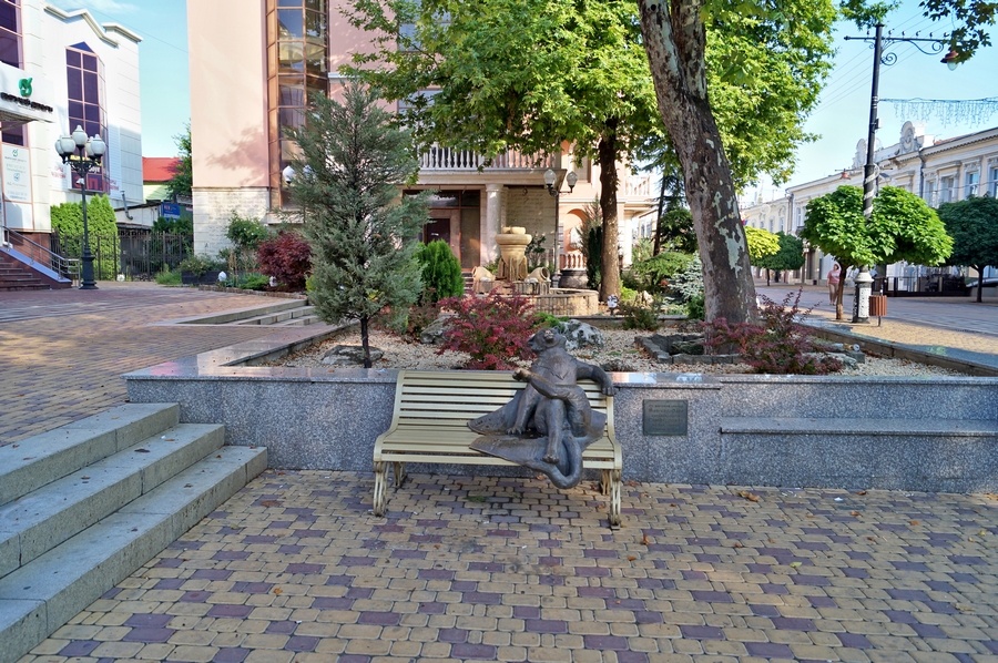 Скульптура была подарена Симферополю в честь 234-летия крымского города, в 2018 году. Памятник размещён в сквере, в центральной части города. Он идеально вписался в архитектурный облик города и стал популярной достопримечательностью среди горожан и туристов. Высота скульптуры составляет около метра. Бронзовая фигура кота находится на одной из скамеек парка. Рядом есть место, где туристы могут сесть и сфотографироваться с памятником.