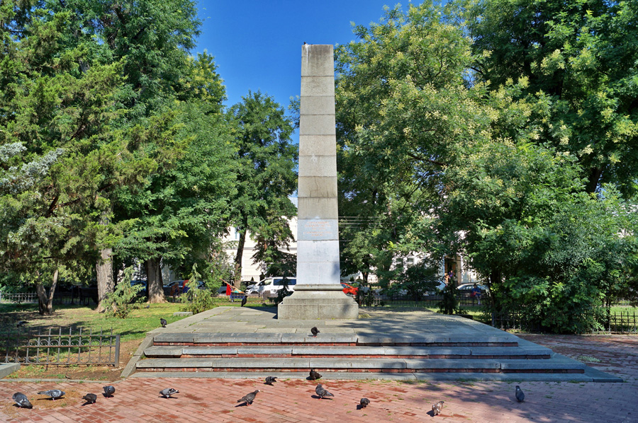 Обелиск на братской могиле красногвардейцев и подпольщиков, расстрелянных белогвардейцами (1918—1920 годы) — в Семинарском сквере, между улицами Гоголя и Самокиша. Установлен в 1957 году. 5 декабря 1920 г. в Симферополе в Семинарском сквере состоялось перезахоронение останков участников партийного и комсомольского подполья, казненных белогвардейцами. Позднее это место было огорожено и отмечено колонной. В 1928 г. художник Глаголев разработал проект памятника «Погибшим борцам революции». 16 сентября 1930 г. Памятник был установлен. Основу его составил трехгранный обелиск. Нижняя часть обелиска была сложена из бутового камня взорванного Александро-Невского кафедрального собора, а верхняя — из ракушечника одного из разобранных домов. Грани обелиска были оштукатурены мраморной крошкой под цвет красного гранита. Штукатурка нижней части памятника имитировала серо-синий гранит. К лицевой стороне обелиска примыкали три плиты. На нижней, положенной горизонтально, была высечена надпись: «Павшим в борьбе за диктатуру пролетариата». Слева от нее располагалась вертикальная плита, на которой были обозначены даты гражданской войны: 1917—1920. Центром композиции являлась плита с изготовленным скульптором Медведовским барельефом рабочего на фоне перекрещивавшихся серпа и молота. Первоначальный памятник был разрушен фашистами во время Великой Отечественной войны. Восстановлен в 1957 году.