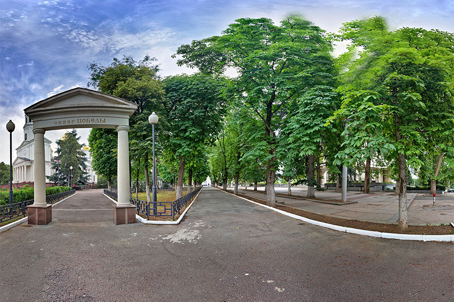 Считается старейшей зеленой зоной, располагается в центральной части столицы, на пересечении улиц Серова и Жуковского. К нему примыкает здание Госсовета Крыма, гостиничный комплекс «Украина», монумент «Долгоруковский обелиск» и Дворец художников. Из достопримечательных объектов заслуживает внимание недавно реконструированный храм Александра Невского, огороженный кованым ажурным забором, и танк на каменном пьедестале. Ежегодно 9 мая от сквера до вечного огня (парк Гагарина) проходят шествия ветеранов и горожан. Вход в парк украшает величественная каменная арка. До собора проложена широкая аллея, от которой отходят другие – более узкие, предназначенные для прогулок посетителей. Зеленые островки оформлены в виде аккуратных травянистых газонов, с возвышающимися вековыми липами. В их тени можно удобно расположиться в знойный день.